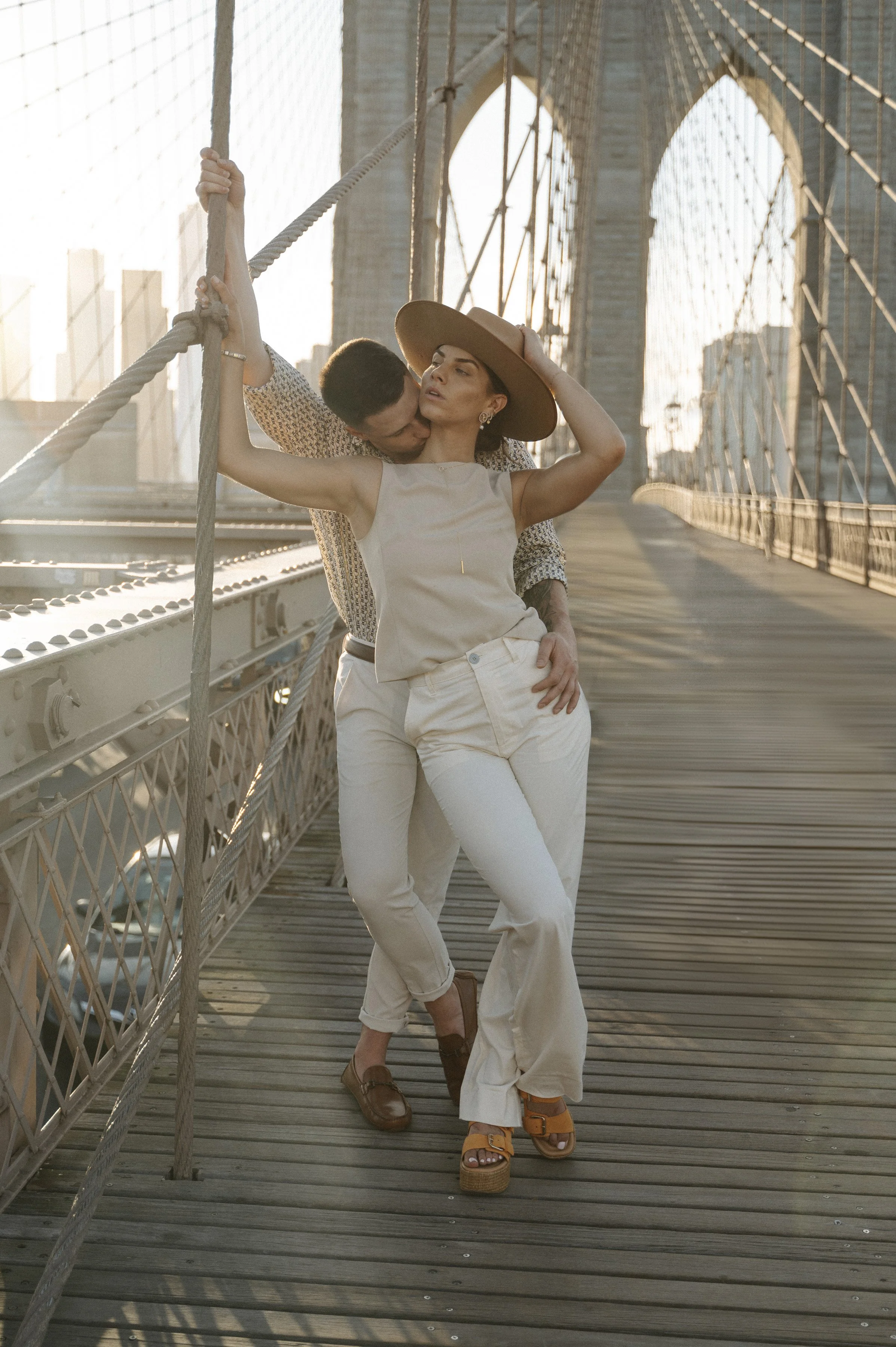 A couple enjoying a moment on a city street at sunset, with the man holding the woman in his arms as they smile at each other. View fullsize